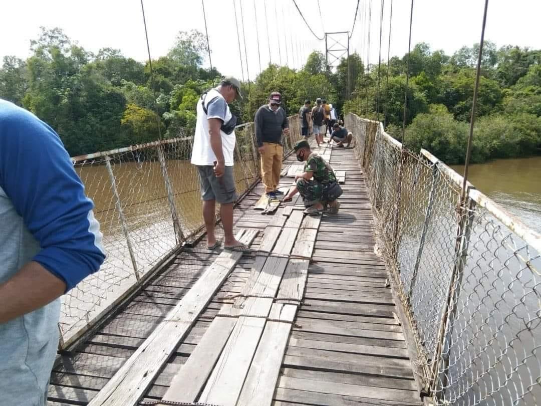 Sekadau -Kepedulian TNI terhadap wilayah binaan tidak perlu diragukan lagi, seperti yang dilakukan Babinsa Koramil 1204 – 22 / Belitang Serda Achmad Chuzaini bergotong royong bersama warga memperbaiki jembatan gantung yang rusak.Rabu (26/10/2022)