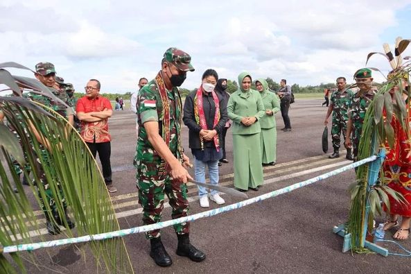 Ketapang – Jajaran Forkopimda Kabupaten Ketapang menyambut kedatangan Pangdam XII/Tanjungpura Mayjen TNI Sulaiman Agusto, S.I.P., M.M., bersama Ketua Persit Kartika Chandra Kirana Daerah XII/Tpr, Ny. Helly Sulaiman Agusto dalam rangka melaksanakan kunjungan kerja di wilayah Kodim 1203/Ktp, Kamis (27/10/2022)