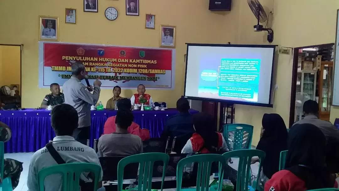 Sambas – Dalam rangka meningkatkan keamanan dan Ketertiban lingkungan masyarakat Anggota Satgas TMMD Imbangan Ke 115 Kodim 1208/Sambas Gandeng Polsek setempat laksanakan Penyuluhan Kamtibmas yang digelar di kantor Desa Lumbang Desa Lumbang, Kec. Sambas, Kab. Sambas, Selasa (01-10-22).