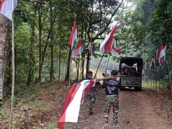 Bengkayang, Kalbar – Menghormati adat istiadat setempat dan sekaligus penyiapan acara dalam rangka menyambut Hari Jadi Kampung Budaya, Bung Kapuak Jagoi Babang Ke-182 Tahun 2022, Personil Pos Komando Utama (Kout) dan Pos Koki Jagoi Babang Satuan Tugas Pengamanan Perbatasan (satgas pamtas) RI-Malaysia Yonif 645/Gardatama Yudha bersama Tokoh Masyarakat, Tokoh Pemuda dan warga masyarakat Desa Jagoi Babang melakukan Karya Bakti pembersihan, pemasangan tenda dan pemasangan bendera merah putih di sekitar Rumah Adat Kampung Budaya Bung Kupuak, Dusun Jagoi Babang, Desa Jagoi Babang, Kecamatan Jagoi Babang, Kab Bengkayang.