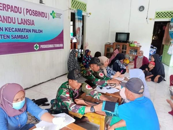 Sambas, Kalbar – Tamtama Kesehatan (Takes) Pos Temajuk Satuan Tugas Pengamanan Perbatasan (Satgas Pamtas) RI-Malaysia Yonif 645/GTY membantu tenaga kesehatan Puskesmas Temajuk menyelenggarakan Program Pos Pembinaan Terpadu (Posbindu) Lanjut Usia (Lansia) untuk warga masyarakat perbatasan, bertempat di Dusun sempadan, Desa Temajuk, Kecamatan Paloh, Kabupaten Sambas.