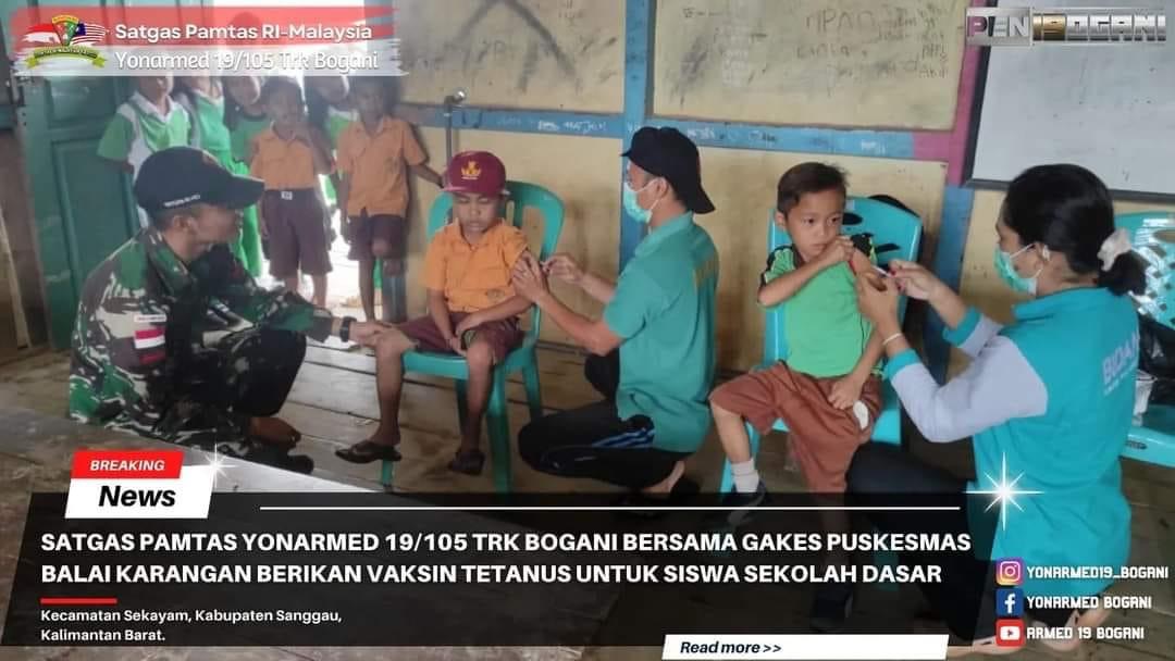 Pemberian vaksin Tetanus toksoid (TT) atau vaksin tetanus ini bermanfaat untuk memberikan perlindungan terhadap infeksi Clostridium tetani yaitu bakteri yang menyebabkan penyakit tetanus terhadap anak-anak siswa Sd 25 Perimpah. Adapun pelaksanaan kegiatan pemberian vaksin tersebut diberikan kepada siswa kelas 3, 4 dan kelas 5 yang dilaksanakan oleh tenaga kesehatan Puskesmas Balai Karangan bersama personel kesehatan Satgas Pamtas Yonarmed 19/105 Trk Bogani Pos Sei Tekam.
