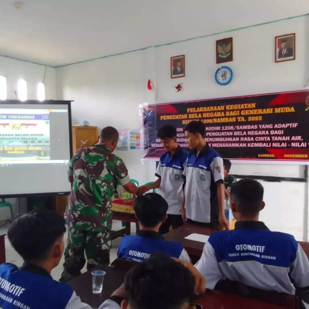 Sambas – Komando Distrik Militer 1208/Sambas melalui Staf Teritorial melaksanakan kegiatan penguatan Bela Negara bagi generasi muda yang bertempat di Ruang Kelas SMK Subur Insani Sambas, Jalan Sejangkung, Desa Senyawan, Kec. Sambas, Kab. Sambas, dengan Tema *” Mewujudkan Binter Kodim 1208/Sambas yang Adaptif melalui kegiatan penguatan Bela Negara bagi generasi muda untuk menumbuhkan cinta tanah air, semangat Nasionalisme dan menanamkan kembali Nilai-Nilai”, Kamis (17-11-22).