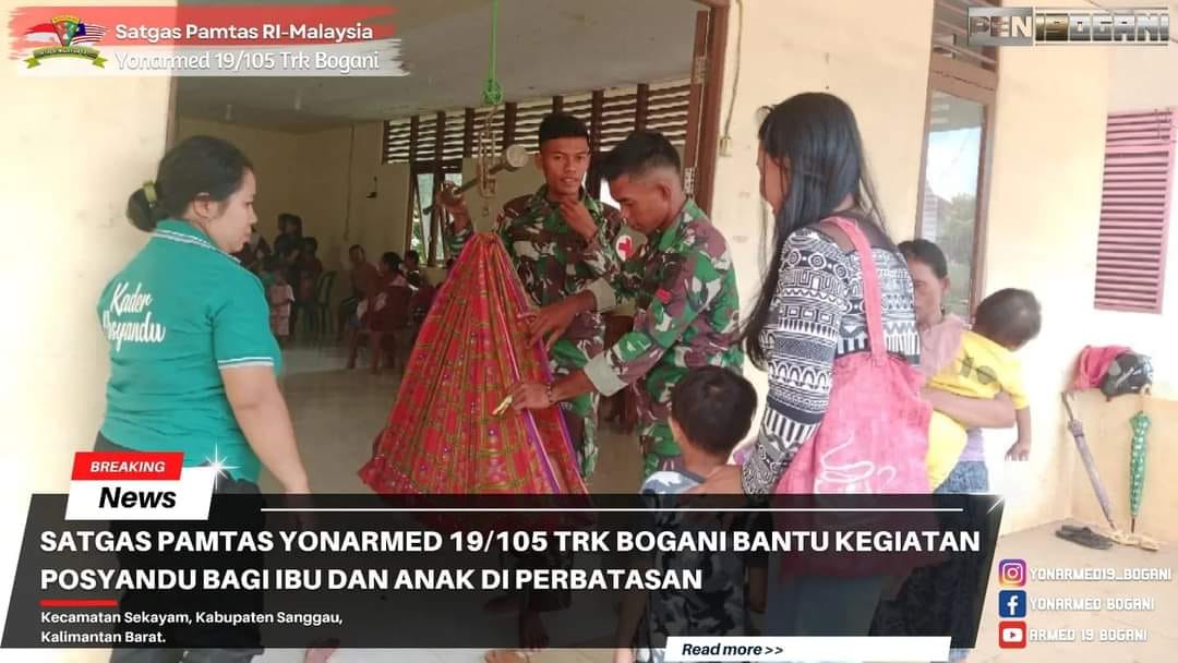 “Keberhasilan pengelolaan posyandu memerlukan dukungan yang kuat dari berbagai pihak, termasuk salah satunya dukungan yang dilaksanakan oleh Satgas Pamtas RI-Malaysia Yonarmed 19/105 Trk Bogani dengan mengerahkan dua orang personel Bakes Pos Sei Beruang Sertu Dwi dan Pratu Nasrun membantu para tenaga kesehatan (Nakes) Kecamatan Sekayam dalam kegiatan bakti kesehatan Pos Pelayanan Terpadu (Posyandu).” Ujar Dansatgas.