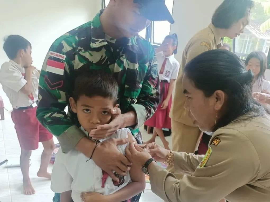 SAMBAS, KALBAR – Prajurit Kesehatan Satuan Tugas Pengamanan Perbatasan (Satgas Pamtas) RI-Malaysia Yonif 645/Gardatama Yudha Pos Sei Bening dipimpin oleh Serda Rohid beserta 2 (dua) orang anggota bantu tenaga kesehatan Puskesmas pembantu (Pustu) Sei Bening memberikan pelayanan Imunisasi kepada anak-anak Sekolah di perbatasan, bertempat di SDN 02 Sei Bening, Dusun air Bening Desa Sei Bening Kecamatan Sajingan Besar Kabupaten Sambas.