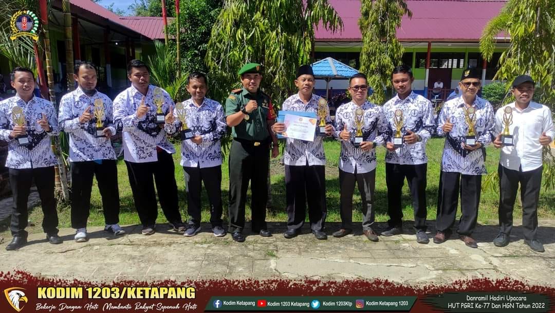 Ketapang – Sebagai bentuk penghormatan kepada Guru dan PGRI, Pj. Danramil 1203-15/Teluk Batang, Pelda Ariyanto hadiri Upacara dalam rangka HUT PGRI Ke-77 dan Hari Guru Nasional Tahun 2022, yang dipusatkan di lapangan SMP Negeri 1 Teluk Batang Kayong Utara. Jum’at (25/11/2022)