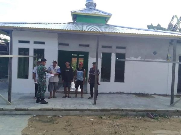 Prajurit Pos Kotis Satgas Pamtas Yonif 645/GTY Dengan penuh kebersamaan dan semangat secara bahu membahu dengan warga masyarakat perbatasan melaksanakan karya bakti pendempulan dinding masjid Al-Kamarul zaman. ujarnya