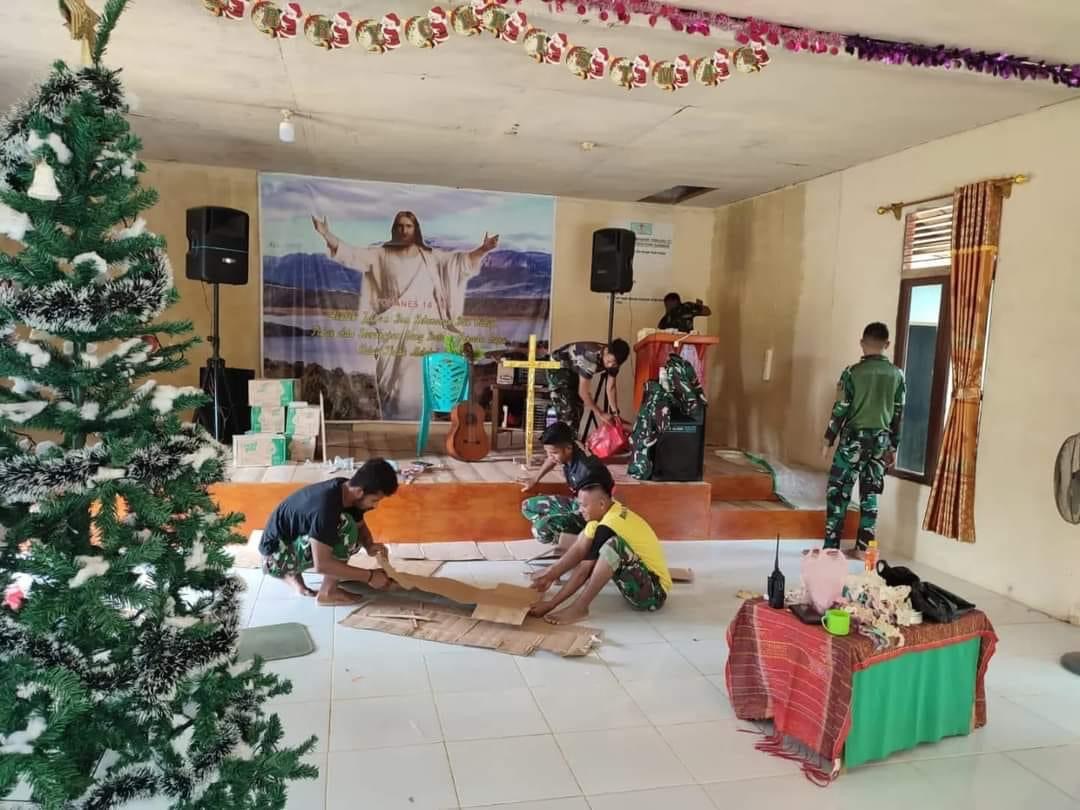 KAPUAS HULU – Dalam rangka menyambut perayaan Hari Natal yang semakin dekat, personel Satgas Pamtas Yonarmed 19/105 Trk Bogani bersama jemaat mendekorasi Gereja Kemah Injil Indonesia di Desa Riam Senjawak dan Gereja GPPS di Desa Sei Beruang. Sabtu 10 Desember 2022.