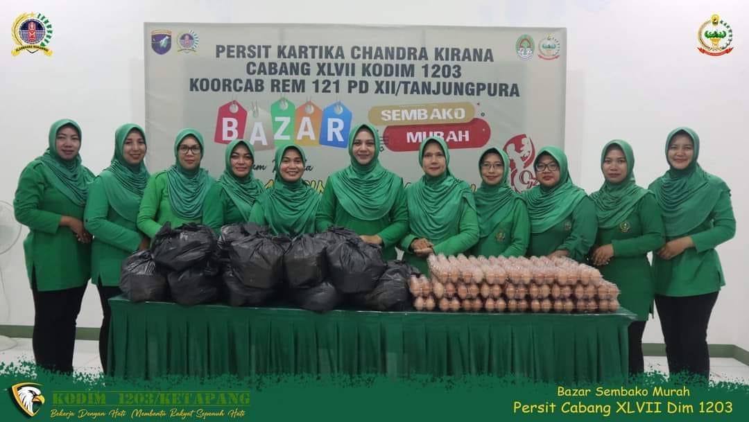 Dandim 1203/Ktp Letkol Inf Alim Mustofa melalui Pasiter Kodim 1203/Ktp Kapten Inf Yulianto menerangkan Bazar sembako murah yang diselenggarakan ini bekerjasama dengan Dinas Koperasi, UKM, Perindustrian dan Perdagangan Ketapang yang diperuntukan untuk Anggota Persit KCK jajaran Kodim 1203/Ktp dan Masyarakat sekitar,”terangnya.