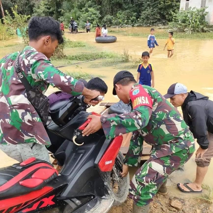 Terlihat dilapangan Babinsa sigap turun ke jalan untuk membantu warga yang menyeberangi genangan air tersebut dengan mengangkat sepeda motor masyarakat untuk melewati banjir tersebut.