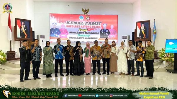 Kayong Utara-Dandim 1203/Ktp, Letkol Inf Alim Mustofa didampingi Ketua Persit KCK Cabang XLVII Kodim 1203, Ny. Minggar Alim Mustofa, hadiri acara malam kenal pamit Kapolres Kayong Utara dari AKBP Arief Hidayat, S.H.,S.I.K, kepada AKBP Achmad Dharmianto, S.H., S.I.K. di Istana Rakyat Sukadana Kayong Utara, Sabtu (7/1/2023).
