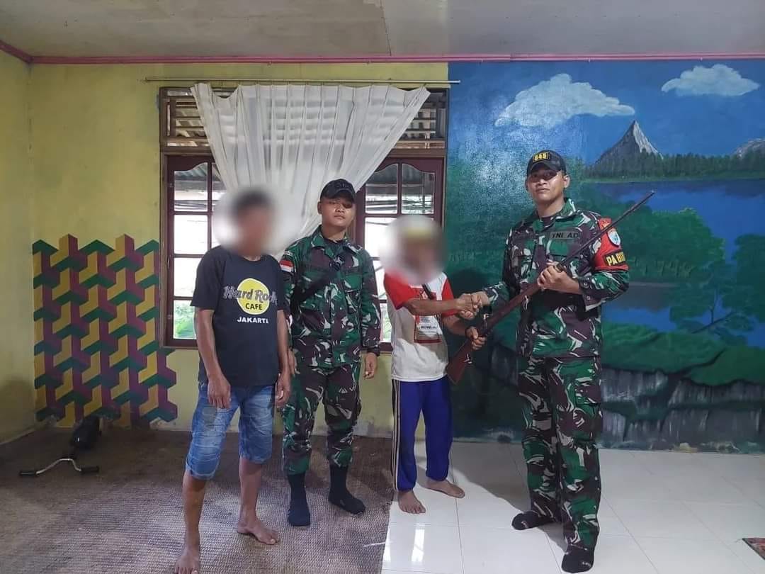 Akhirnya bapak BS (62) dengan sukarela dan tanpa ada paksaan menyerahkan 1 (satu) pucuk senjata api rakitan jenis lantak miliknya kepada Pa Bintal Satgas Pamtas Yonif 645/GTY.