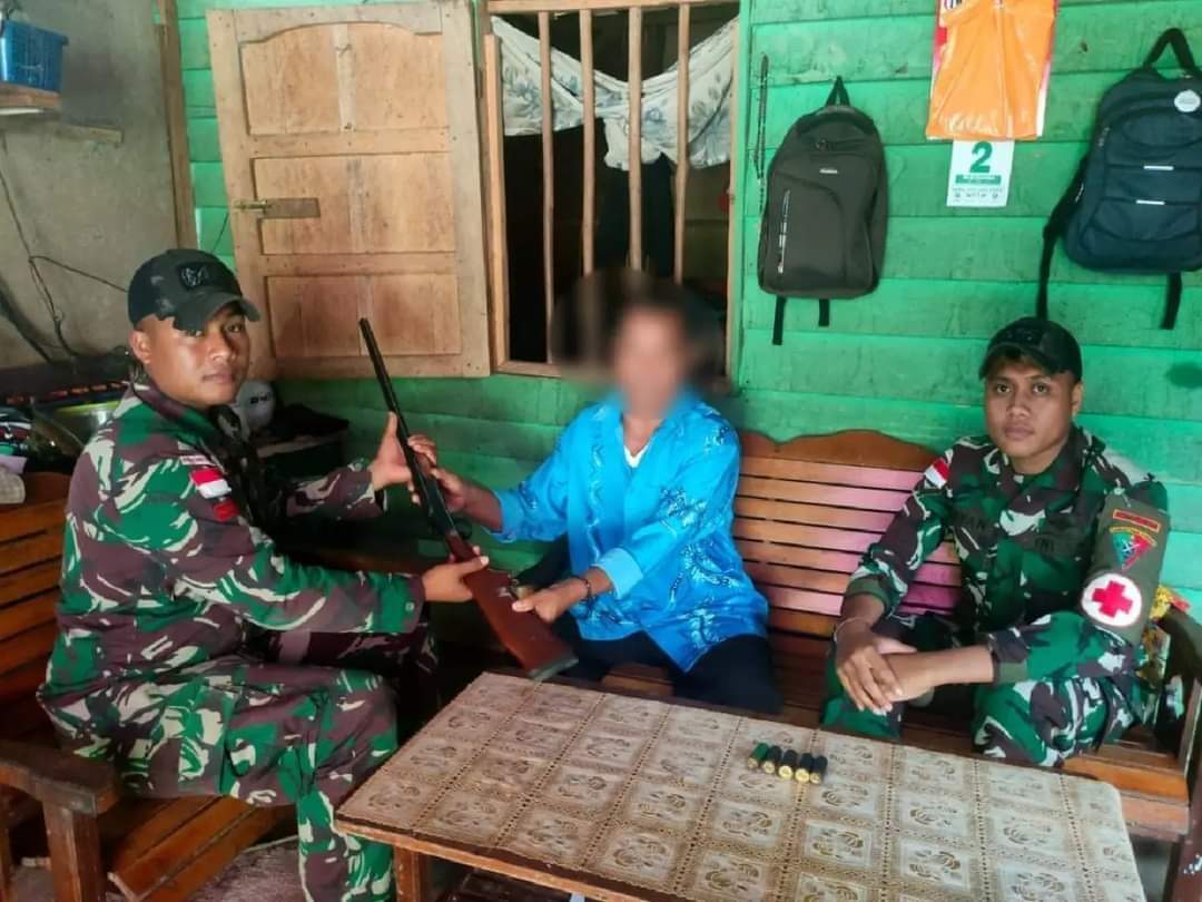 Akhirnya bapak MA (56) dengan sukarela dan tanpa ada paksaan dari pihak manapun menyerahkan 1 (satu) pucuk senjata api rakitan jenis Bomen beserta 5 (lima) butir munisi miliknya kepada Bintara Kesehatan (Bakes) Pos Kout Satgas Pamtas Yonif 645/GTY Serda Wayan Arte Graha.