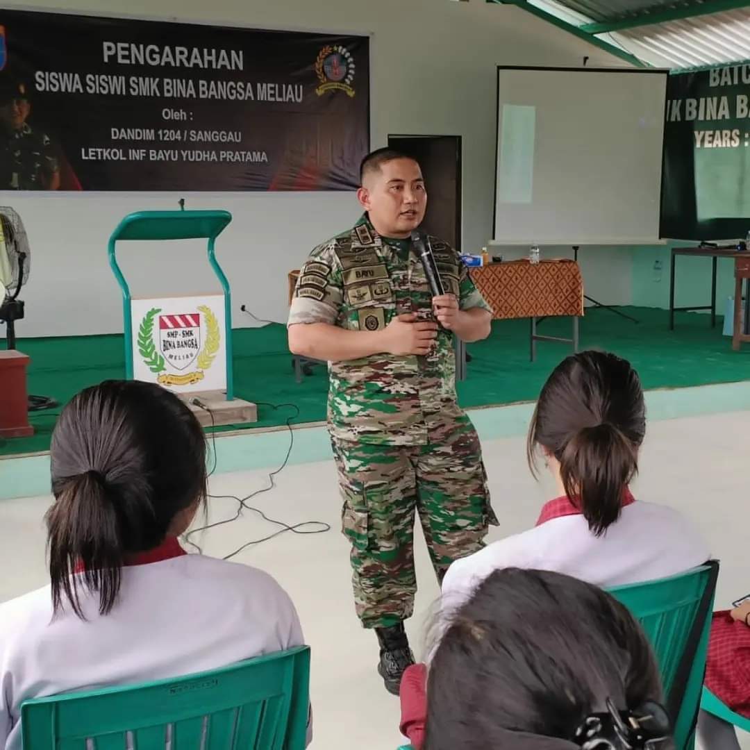 Sanggau – Komandan Kodim 1204 /Sanggau Letkol Inf Bayu Yudha Pratama memberikan pengarahan kepada siswa-siswi SMK Bina bangsa Meliau di Aula SMK Bina Bangsa Meliau di Desa,Meliau Hilir.Kec,Meliau.Kab,Sanggau.Jumat (10/02/2023)