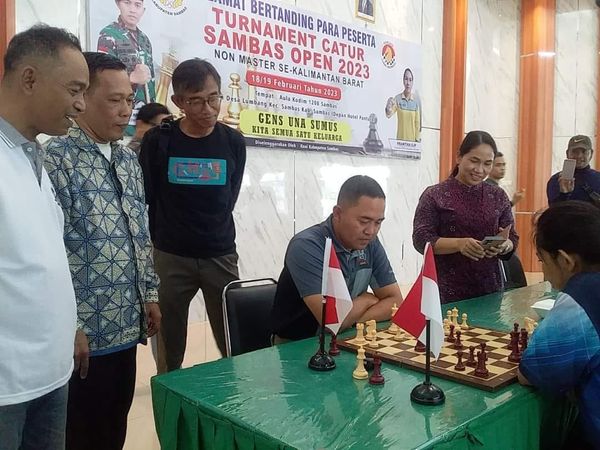 Sambas – Komandan Kodim 1208/Sambas membukan Turnamen Catur Sambas Open 2023 Non Master Se-Kalimantan Barat bertempat di Aula Kodim 1208/Sambas, Jalan Tabrani, Desa lumbang, Kec. Sambas, Kab. Sambas, Kegiatan dilaksanakan dua hari ( 18-19/02/23).