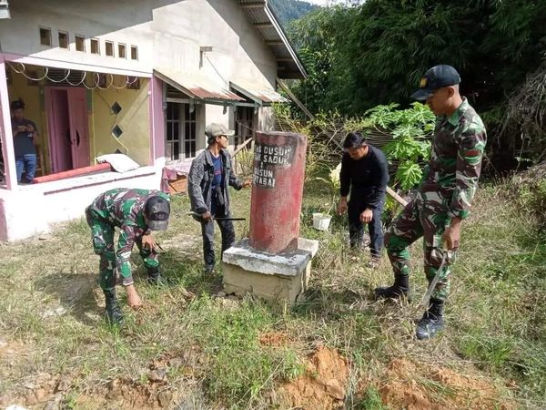 SANGGAU, KALBAR – Prajurit Pos Lubuk Tengah Satuan Tugas Pengamanan Perbatasan (Satgas Pamtas) RI-Malaysia Yonif 645/Gardatama Yudha Bersama warga masyarakat perbatasan melaksanakan karya bhakti pembersihan dan pengecatan patok batas dusun, bertempat di Dusun Lubuk Tengah, Desa Lubuk Sabuk, Kecamatan Sekayam, Kabupaten Sanggau.