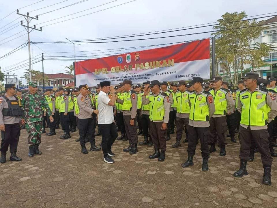 Putussibau, Untuk kesiapan pelaksanaan kegiatan tabligh Akbar bersama Ustadz Abdul Somad di kabupaten Kapuas Hulu, anggota Kodim 1206/Psb ikuti gelar Pengamanan bersama dengan Polres Kapuas Hulu bertempat di halaman Polres Kapuas Hulu, Sabtu, 4/3/2023.