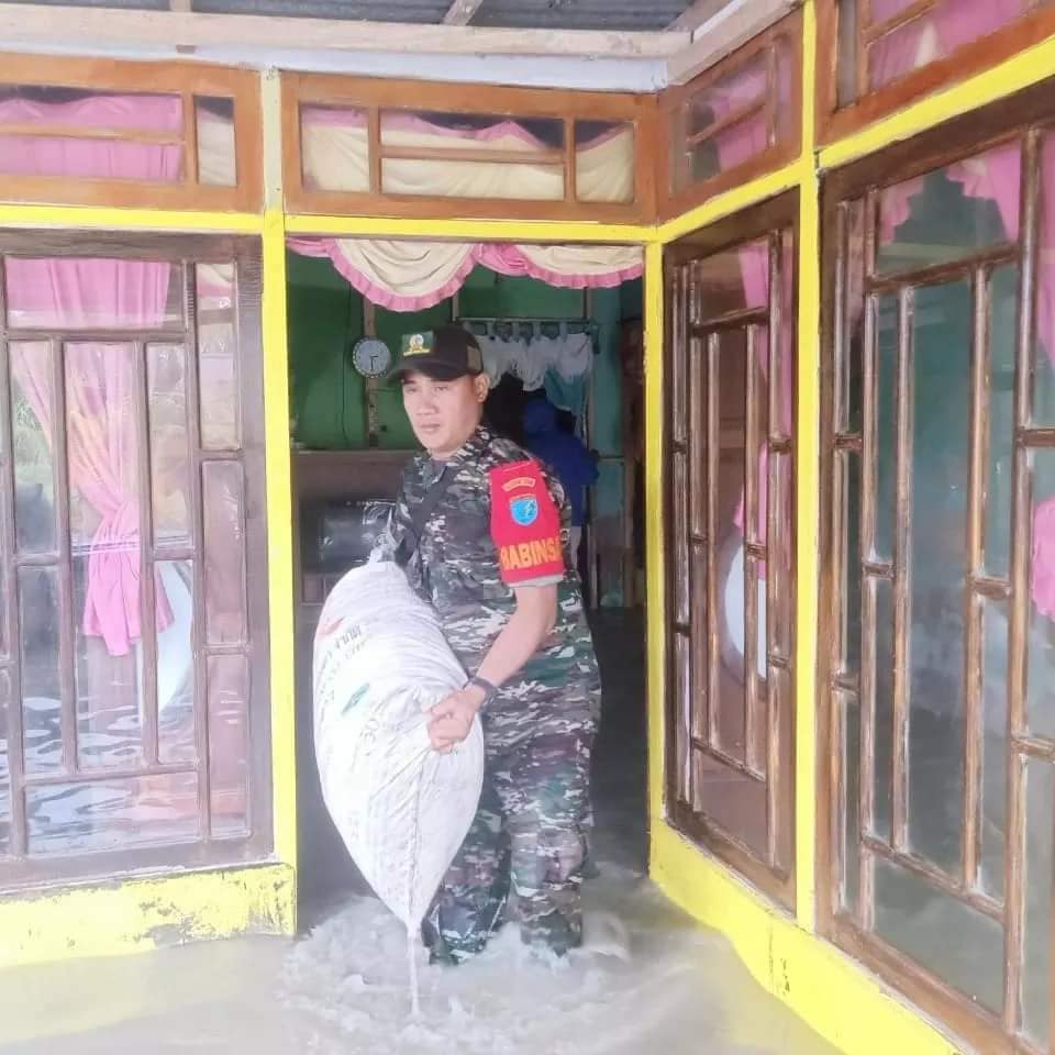 Terlihat juga Babinsa basah kuyup demi membantu mengangkat barang milik warga yang terkena banjir, ke tempat yang lebih tinggi agar lebih aman.