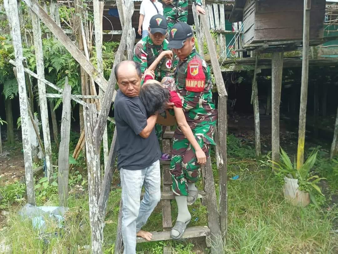 KAPUAS HULU – Personel Satgas Pamtas RI-Malaysia Yonarmed 19/105 Trk Bogani membantu mengevakuasi seorang warga yang sakit dan tidak bisa berjalan di Dusun Tangit 1,Desa Tangit, Kecamatan Badau, Kabupaten Kapuas Hulu, Kalimantan Barat.