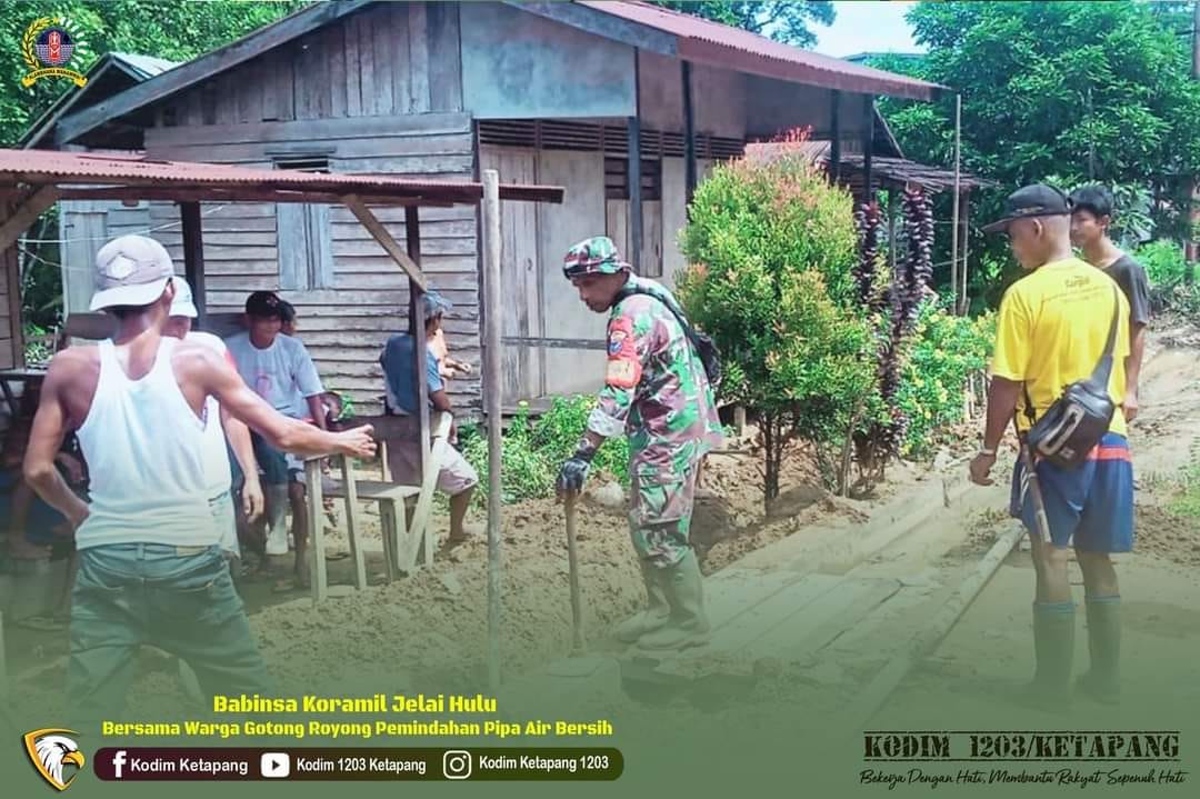 Ketapang – Serda Leviasnus Yapen, Babinsa Koramil 1203-14/Jelai Hulu bersama masyarakat melaksanakan gotong royong pemindahan pipa air bersih yang berlokasi Dusun Slandai Indah Desa Pangkalan Paket, Kecamatan Jelai Hulu. Ketapang. Selasa (28/3/2023).