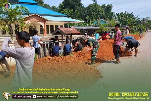 Menjelang berbuka Babinsa dan warga terlihat sangat kompak dan solid melaksanakan gotong royong berupa pengurugkan/meratakan tanah pada jalan masuk Masjid yang rencananya juga akan di lakukan pengecoran,”ungkap Serda Efendi.