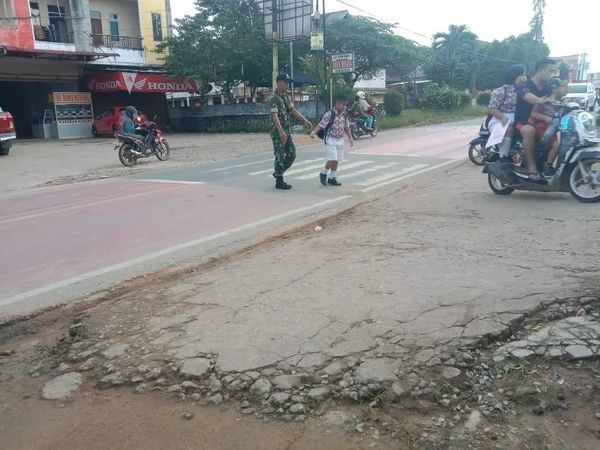Sertu Hiras mengatakan membantu anak- anak sekolah dalam aktivitas pagi hari yang hendak menyeberang yang akan masuk Sekolah adalah salah satu wujud Babinsa peduli dengan keselamatan anak-anak.