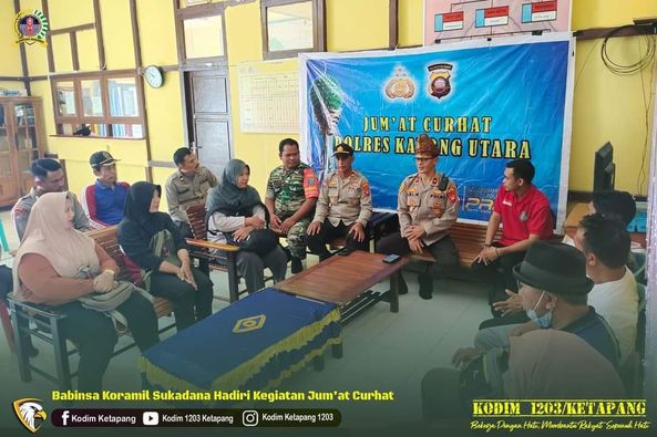 Kayong Utara – Koptu Muhamad Hanafi, Babinsa Koramil 1203-02/Skd, hadiri kegiatan Jum’at Curhat Polsek Sukadana bersama Wakapolres Kayong Utara Kompol Adi Nugroho, S.H, di Desa Gunung Sembilan, Kec. Sukadana, Kayong Utara. Jum’at (14/4/2023).