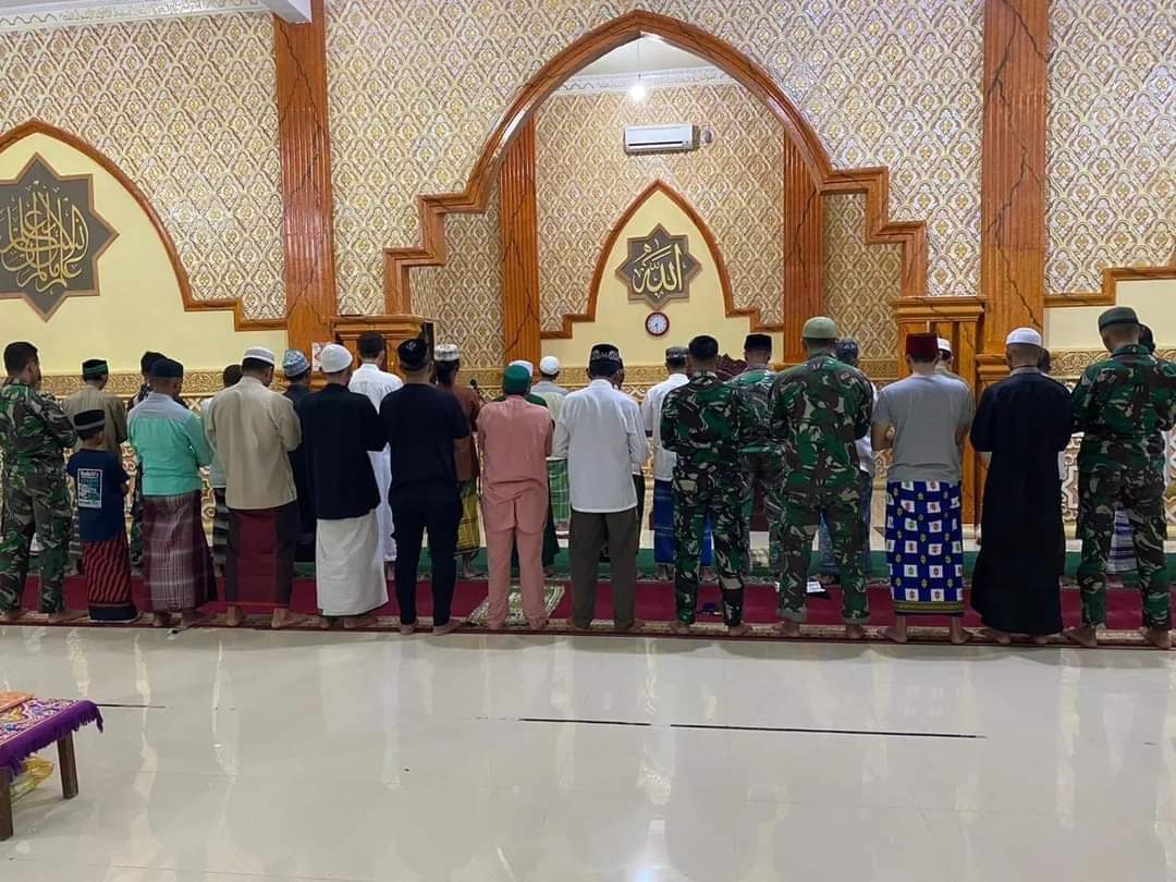 SANGGAU, KALBAR – Dalam rangka wujudkan kebersamaan serta untuk menjalin silaturahmi dengan warga masyarakat di wilayah perbatasan, Prajurit Pos Koki SSK IV Balikarangan Satuan Tugas Pengamanan Perbatasan (Satgas Pamtas) RI-Malaysia Yonif 645/Gardatama Yudha melaksanakan sholat tarawih bersama dengan warga perbatasan. bertempat di masjid muhajirin Desa Kenaman, Kecamatan Sekayam, Kabupaten Sanggau, Kalimantan Barat.