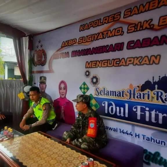 Sambas – Sertu Ketut Babinsa Koramil 01/Sambas Kodim 1208/Sambas bersama Polres Sambas melaksanakan pengamanan di Pos Pam yang berada di jalan Gusti Hamzah, Desa Pasar Melayu, Kec. Sambas, Kab. Sambas, Minggu (23-04-23).