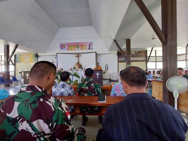 BENGKAYANG, KALBAR – Bukti wujud Toleransi antar umat beragama, kepedulian dan kecintaan terhadap warga masyarakat daerah perbatasan, Prajurit Satuan Tugas Pengamanan Perbatasan (Satgas Pamtas) RI-Malaysia Yonif 645/Gardatama Yudha hadiri acara kegiatan temu Orang Muda Katolik (OMK) Singkawang, Bengkayang, Sambas (Singbebas) yang diselenggarakan oleh Paroki Santo Mikael Jagoi Babang, bertempat di Dusun Jagoi, Desa Jagoi, Kecamatan Jagoi Babang, Kabupaten Bengkayang.