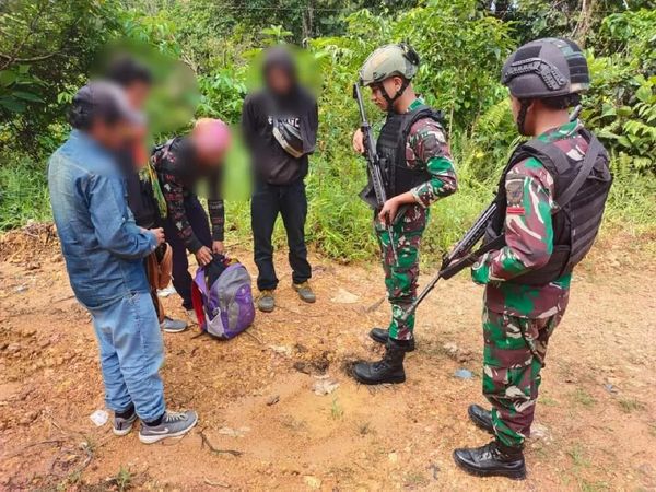 BENGKAYANG, KALBAR – Menjelang Purna Tugas Prajurit Pos KOKI SSK II Jagoi Babang Satuan Tugas Pengamanan Perbatasan (Satgas Pamtas) RI-Malaysia Yonif 645/Gardatama Yudha lebih memperketat pengawasan dan pengamanan jalan-jalan tikus dengan melakukan kegiatan Ambush dan Patroli keamanan, kali ini Prjurit Satgas Pamtas berhasil menggagalkan 4 (empat) orang WNI yang diduga PMI Non Prosedural di jalur tidak resmi/jalan tikus sektor Pos Koki Jagoi Babang, di Desa Jagoi, Kecamatan Jagoi Babang, Kabupaten Bengkayang, Kalimantan Barat.