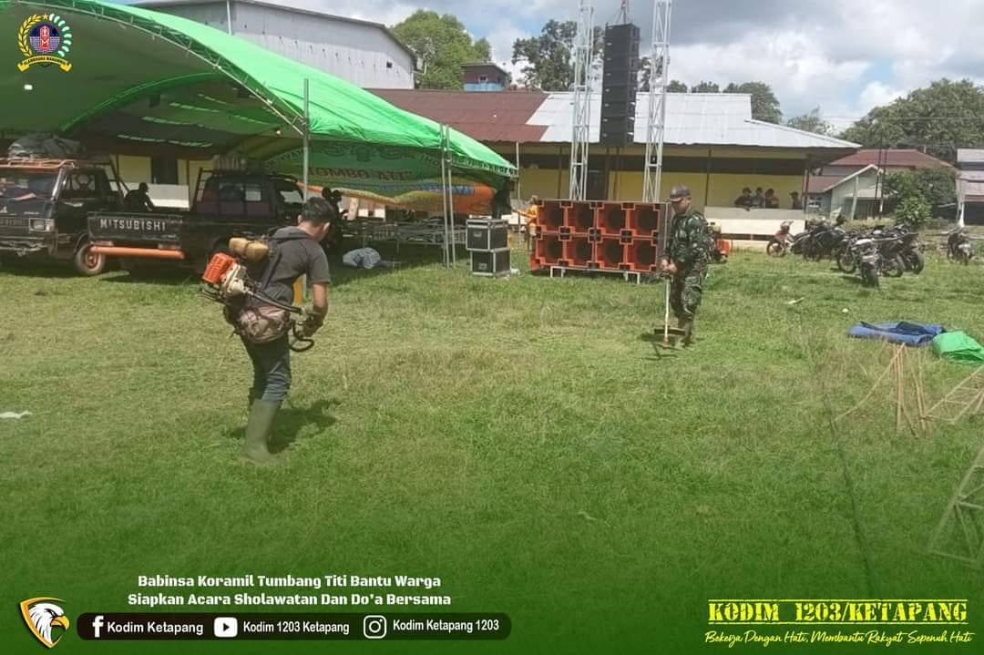 Seperti yang dilakukan oleh Kopda Sugiyanto, Babinsa Koramil 1203-09/Tumbang Titi, Jajaran Kodim 1203/Ktp yang turut membantu menyiapkan warga menyiapkan Acara Sholawatan Dan Do’a Bersama Jam’iyyah Tombo Ati, yang akan digelar di lapangan Sepak Bola Kecamatan Tumbang Titi, Kab. Ketapang. Minggu (7/5/2023).