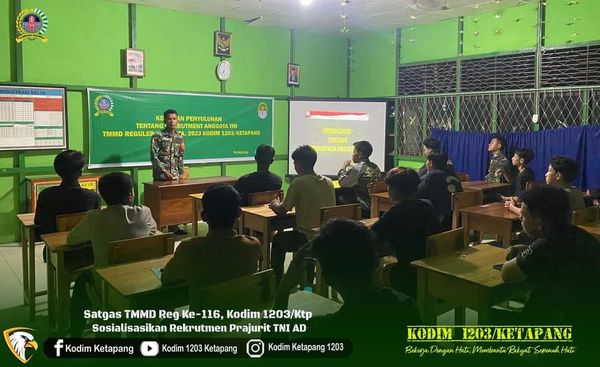 Ketapang – Satgas TMMD Reguler Ke-116, Kodim 1203/Ktp, sosialisasikan pendaftaran rekrutmen prajurit TNI AD kepada pemuda yang berkeinginan menjadi seorang Prajurit, di Desa Harapan Baru, Kec. Matan Hilir Selatan, Kab. Ketapang. Selasa (22/5/2023).