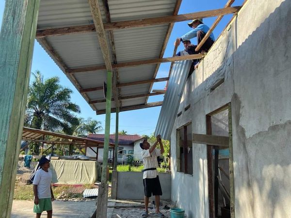 Sekarang sudah memasuki tahap Pemasangan atap seng yang dilakukan secara bergotong-royong antara Anggota Satgas TMMD bersama warga Dusun Lubuk Lagak Desa Lubuk Dagang Kecamatan Sambas