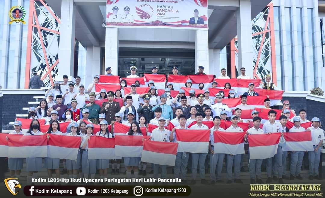 Dandim 1203/Ktp melalui Pasiter Kodim 1203/ktp, Kapten Inf Andri Fitri mengucapkan Selamat Memperingati Hari Lahir Pancasila Tahun 2023, mari tingkatkan kepedulian untuk lebih mengenalkan dan mengajarkan nilai-nilai Pancasila kepada para generasi muda memperkokoh persatuan dan kesatuan bangsa” tuturnya.