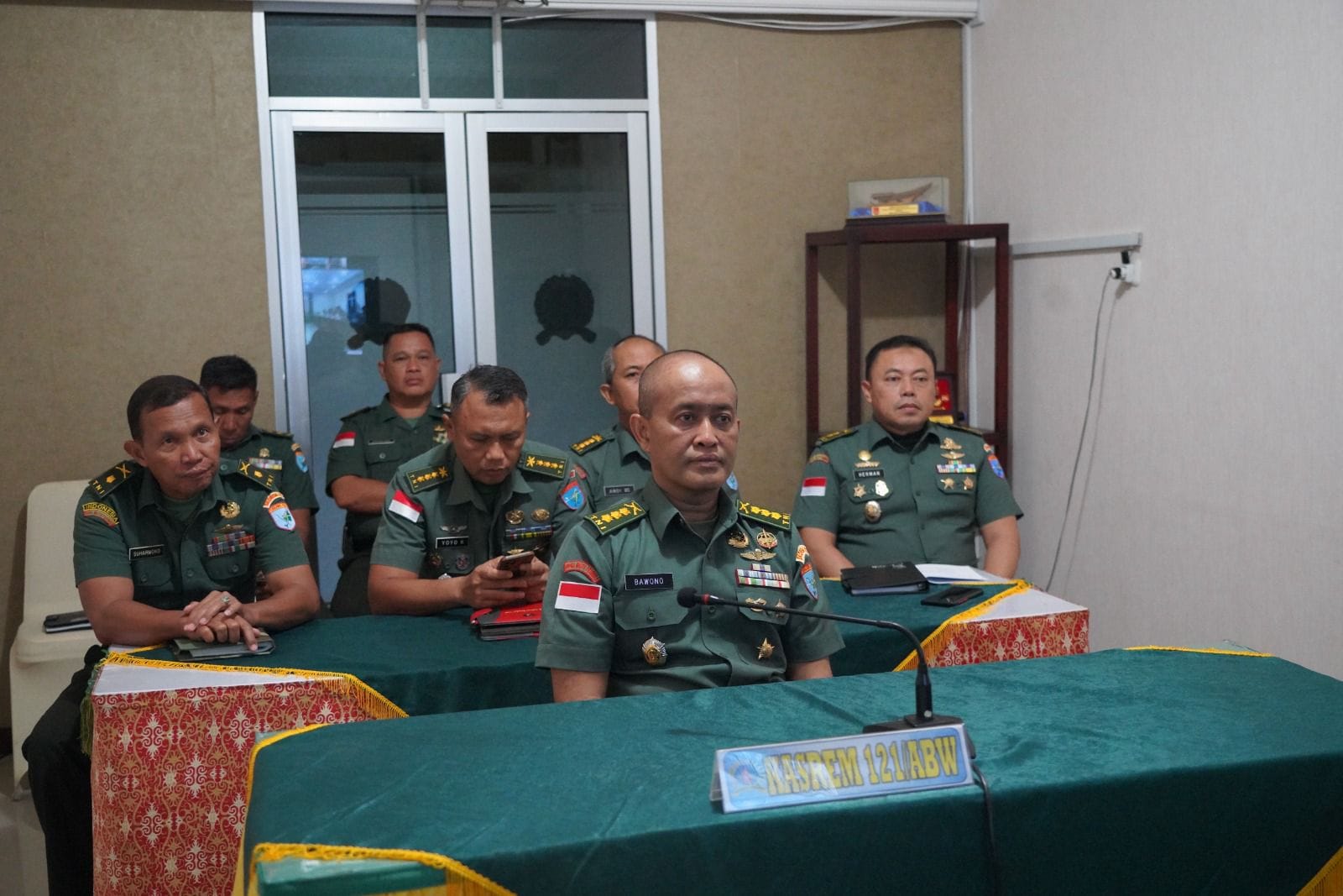 Sintang, Danrem 121/Abw Brigjen TNI Pribadi Jatmiko, S. Hub.Int., M.A. diwakili Kasrem 121/Abw Kolonel Inf Soelistyo Bawono mengikuti Vicon Taklimat Akhir Pelaksanaan kegiatan Pengawasan Post Audit Itjenad TA 2023 di Satuan Jajaran Kodam XII/Tpr. Yang dilaksanakan di Kodam XII/Tpr dan diikuti oleh Satuan Jajaran Kodam XII/Tpr melalui Vicon, Rabu (14/6/2023).