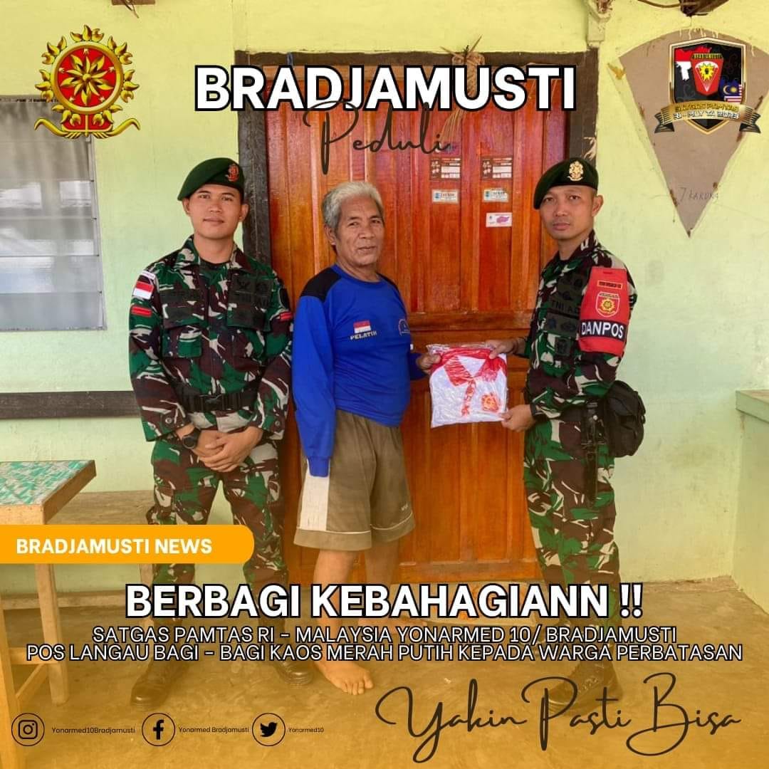 Sebagai wujud kepedulian dan kecintaan terhadap warga, anggota Satgas Pamtas RI-Malaysia Yonarmed 10 / Bradjamusti memberikan bantuan berupa pakaian baju merah putih kepada warga Desa Langau, Kecamatan Puring Kencana, Kabupaten Kapuas Hulu, Kalbar. Senin (24/07/2023)