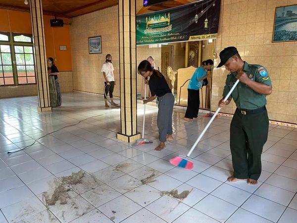 Babinsa Nibung Serda Naziri mengajak Mahasiswa KKN kebangsaan melaksanakan kegiatan Baksos bersama masyarakat Desa Nibung membersihkan mesjid Aulia yang berada di Dusun Mekar, Desa nibung. KKN kebangsaan Kec. Paloh, Kamis (27/07).
