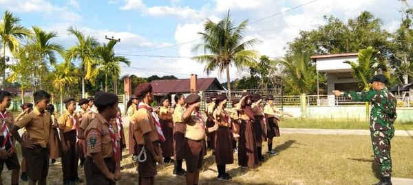 Sambas, Kalbar -Pos Koki Sajingan Terpadu Satgas Pamtas Yonarmed 16/TK Dpp Serda Aldi bersama dengan 1 orang anggota melaksanakan kegiatan *Pelatihan PBB Pramuka* kepada Siswa Siswi SDN 01 Aruk, Des. Sajingan Besar, Kec. Sajingan Besar, Kab. Sambas.