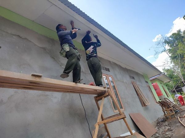 Anggota Satgas TMMD kini melaksanakan pembangunan dua bangunan yaitu Posyandu dan balai pertemuan,yang saat ini sudah memasuki tahap pemasangan plafon yang dikerjakan langsung Satgas TMMD dibantu masyarakat Mantoman.