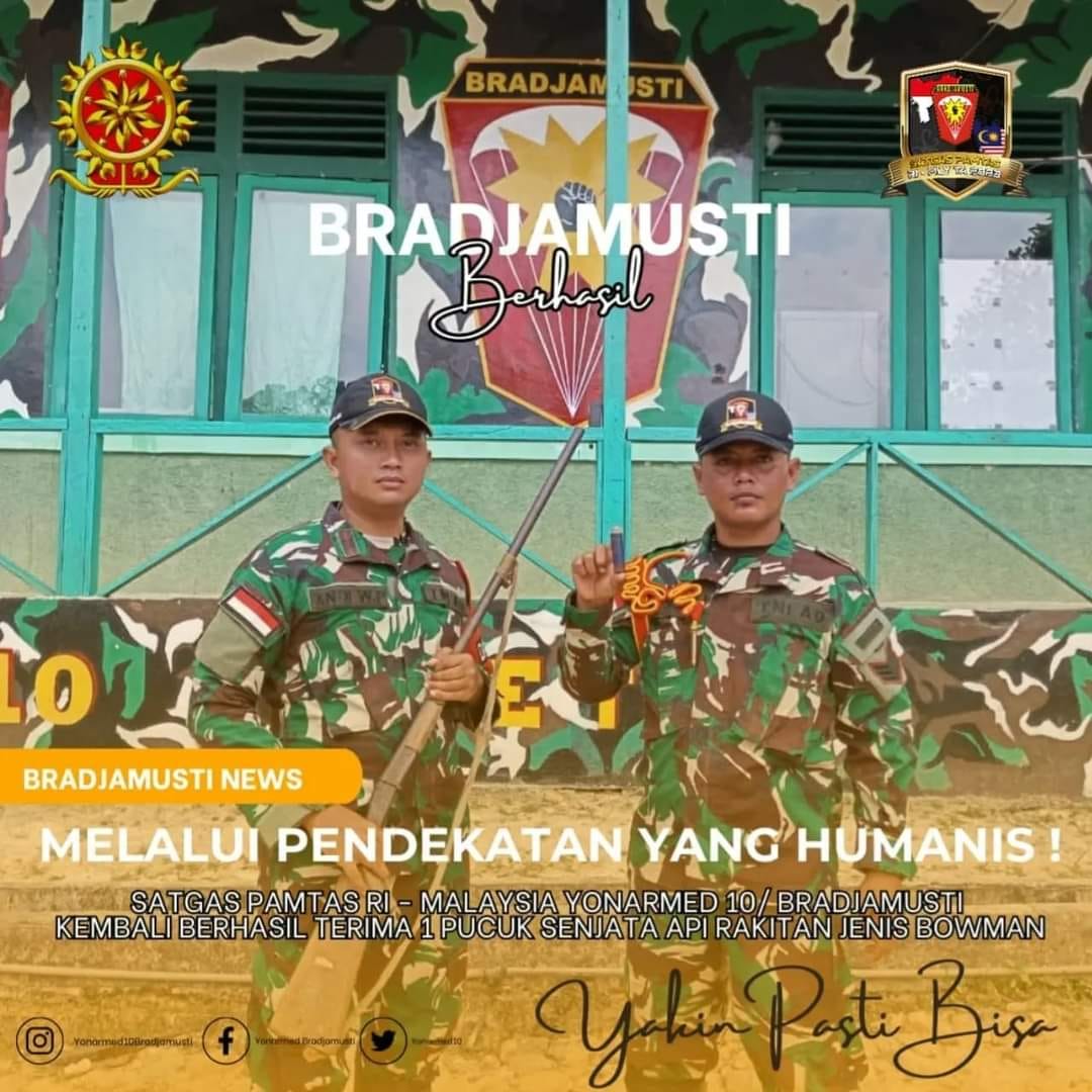 Salah satu bukti nyata keberhasilan komunikasi sosial yang dilaksanakan di wilayah penugasan, personel Satgas Pamtas RI-Malaysia Yonarmed 10/ Bradjamusti kembali menerima satu pucuk senjata api rakitan laras panjang dari salah seorang warga berinisial D (45) yang merupakan salah satu warga di Dusun Sei Beruang, Kecamatan Sekayam , Kabupaten Sanggau, Kalimantan Barat.