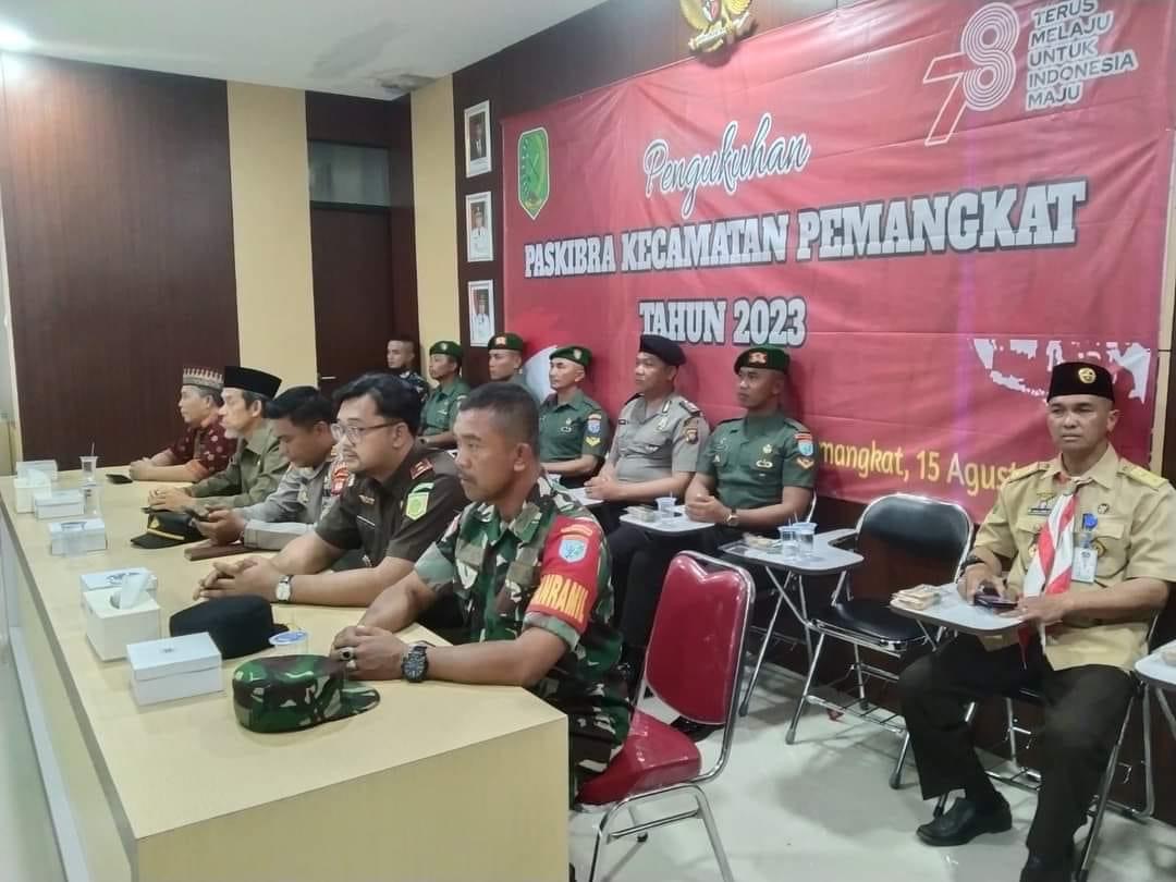 Hadir dalam kegiatan tersebut antara lain, Plt Camat Pemangkat Hajibi SH, Danramil 05/Pmk Kpt Inf Karyadi, Kapolsek Pmk Akp Amril SH.S.Ap, Kacapjari Pemangkat Bpk Dodhy Aryo yudo SH.M, Danki B Yonif 645/Gty, Kpt Inf Ihkwan S.Tr Han serta Anggota Paskibraka Kecamatan Pemangkat.