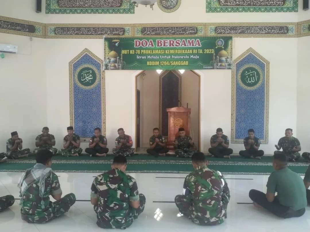 Mewakili Dandim 1204 / Sanggau Pasi ops Kapten Inf Yunus menyampaikan, bahwa acara doa bersama ini digelar menjelang peringatan HUT RI ke-78, bertujuan untuk meningkatkan iman dan taqwa serta memohon kepada Allah SWT bagi keselamatan bangsa. Sesuai dengan tema HUT RI ke-78 “Terus Melaju Untuk Indonesia Maju”.