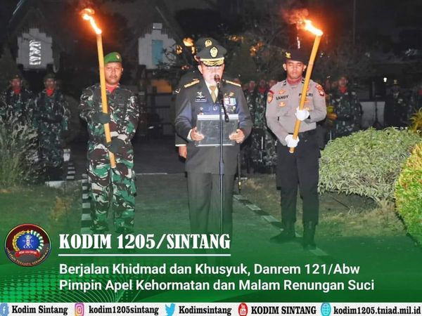 Dalam Pelaksanaan apel ini ditandai dengan penyalaan api obor, doa serta mengheningkan cipta yang dipimpin langsung oleh Danrem 121/Abw. Apel kehormatan dan malam renungan suci yang diikuti perwakilan Korem 121/Abw, Kodim 1205/Sintang, Yonif 642/Kps, Denpom XII/1 Stg, Yon C Pelopor Sintang, Satpol PP Kabuapten Sintang, Dishub, Damkar dan SMKN 1 Sintang ini merupakan salah satu rangkaian yang rutin dilaksanakan setiap tahun, sebelum acara puncak detik-detik proklamasi Kemerdekaan Republik Indonesia Ke-78 diperingati.