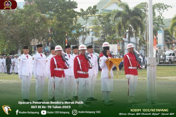 Pelaksanaan Upacara Penurunan Bendera Merah Putih Peringatan HUT RI Indonesia ke-78 Tahun 2023 berjalan lancer, Bertindak sebagai inpsektur upacara Wabup Ketapang H. Farhan, SE.,M.Si, sedangkan bertindak sebagai komandan upacara Letda Laut (PM) Iwan Supriadi.