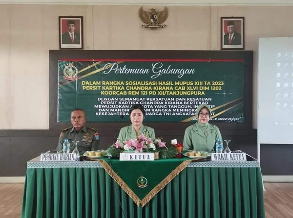 Ketua Persit KCK cab XLVI Ny . Rika Ferdy menyatakan Pertemuan gabungan dilakukan dalam rangka sosialisasi hasil musyawarah pusat Persit Kartika Chandra Kirana kepada anggota Persit KCK Cabang XLVI Kodim 1202/Skw.