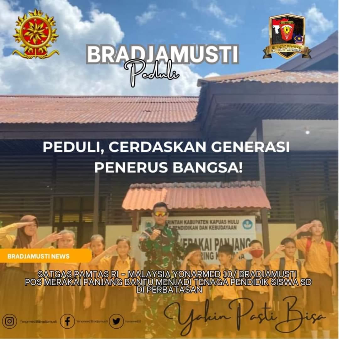 Wujudkan kepedulian terhadap Pendidikan siswa-siswi perbatasan dan meningkatkan generasi penerus bangsa, Prajurit Satuan Tugas Pengamanan Perbatasan (Satgas Pamtas) RI-Malaysia Yonarmed 10/ Bradjamusti bantu menjadi tenaga pendidik (Gadik) dan mengajar di SDN 04 Desa Merakai Panjang, Kecamatan Puring Kencana, Kabupaten Kapuas hulu, Kalbar.