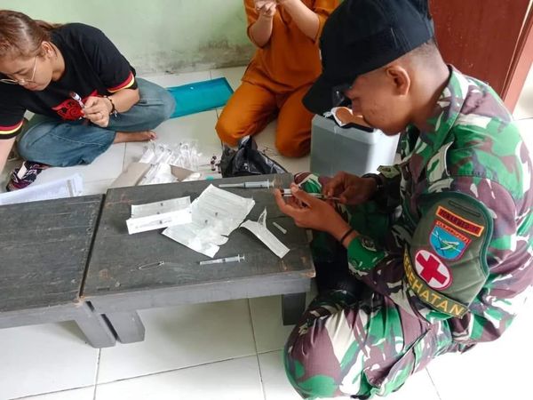 Kegiatan ini dilakukan oleh 2 orang tenaga kesehatan Pos Koki Sajingan Terpadu Satgas Pamtas Yonarmed 16/Tk Seda Aldi dan Pratu Nanang Ferara bersama Tenaga Kesehatan Puskesmas Sajingan Besar berupa penyuntikan *Bias MR dan HPV* kepada Anak SDN 01 Aruk.