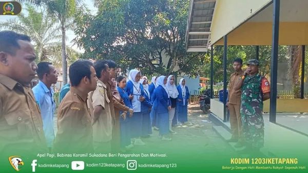 Koramil 1203/Skd, memimpin Apel pagi bertempat di Halaman Kantor Desa Pangkalan Buton, Kec. Sukadana, KKU. Senin (28/8/2023)