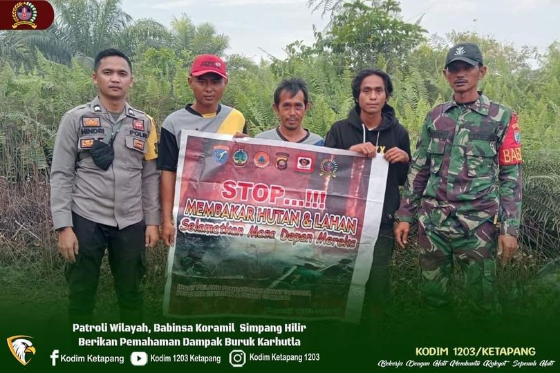Kayong Utara – Sebagai upaya mencegah kebakaran Hutan dan lahan diwilayah, Babinsa Koramil 1203-11/Sph, Sertu Supriyadi Iswanto bersama Babinkamtibmas Polsek Simpang Hilir Briptu Hindri melaksanakan patroli wilayah sembari memberikan pemahaman tentang dampak buruk yang ditimbulkan akibat Karhutla.